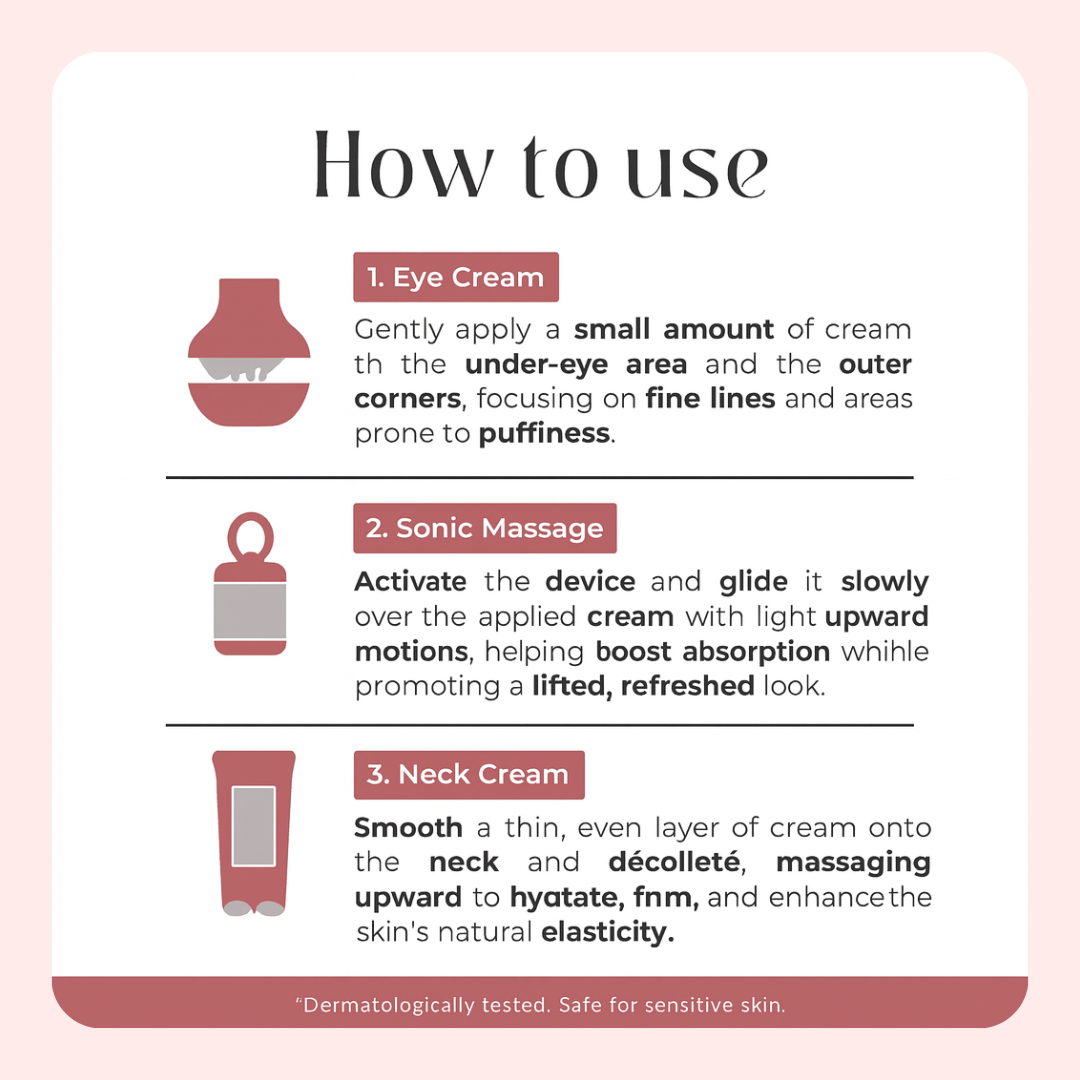 This encourages product absorption, boosts lymphatic drainage, and delivers a cooling, spa-like experience. Use light pressure — let the applicator do the work.